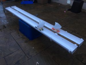 We have found that capping a pair of square profile gutters works well, using external stopends, and a few mounting brackets. When setting up it’s worth trying to get the setup level, say on a table or a-frame tressles, otherwise you will have more water at one end than the other!